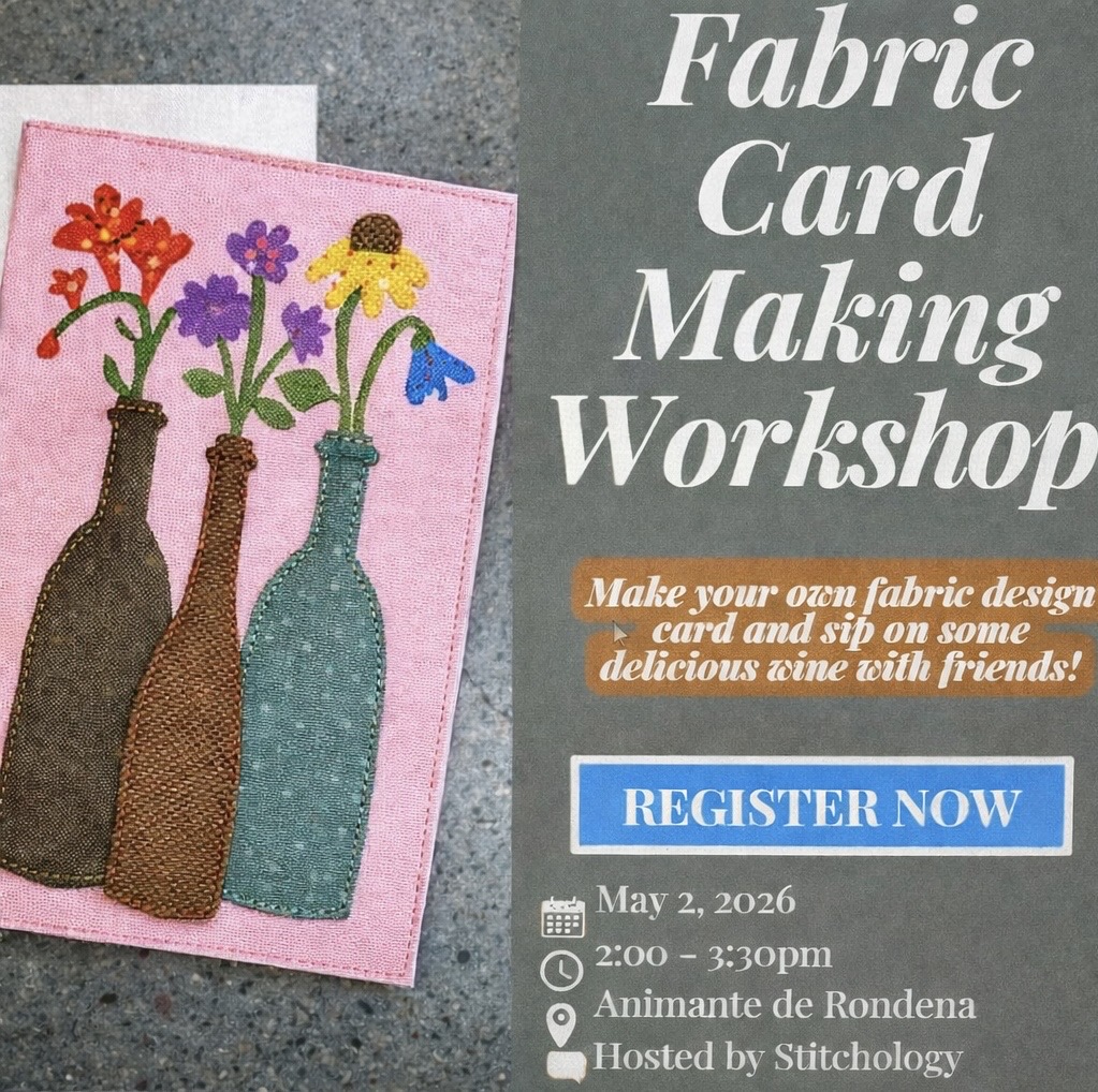 Grab a glass, pick your fabric, and let your creativity flow! Join us for a lively card making class filled with wine, laughter, and colorful vibes.