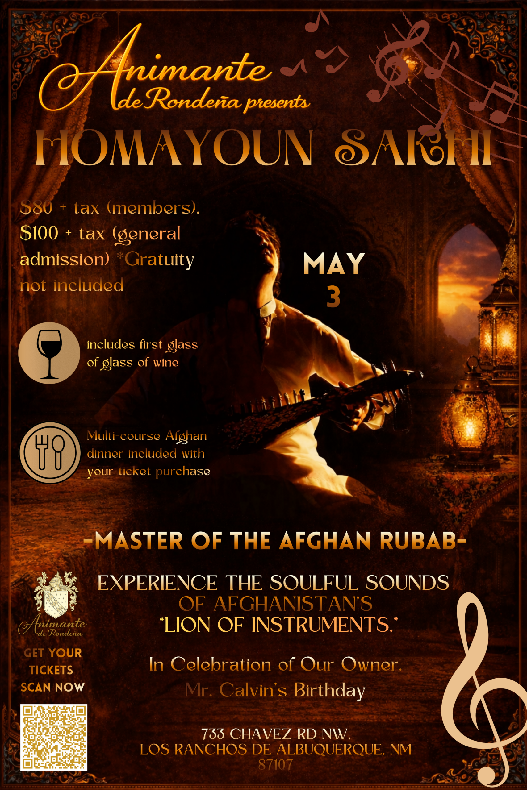 Join us for an unforgettable evening of wine, culture, and music as we celebrate owner John Calvin’s birthday. Enjoy a thoughtfully curated multi-course Afghan dinner, followed by a mesmerizing live performance by world-renowned rubab virtuoso Homayoun Sakhi. Experience the rich, soulful sounds of this traditional Afghan instrument in an intimate setting.